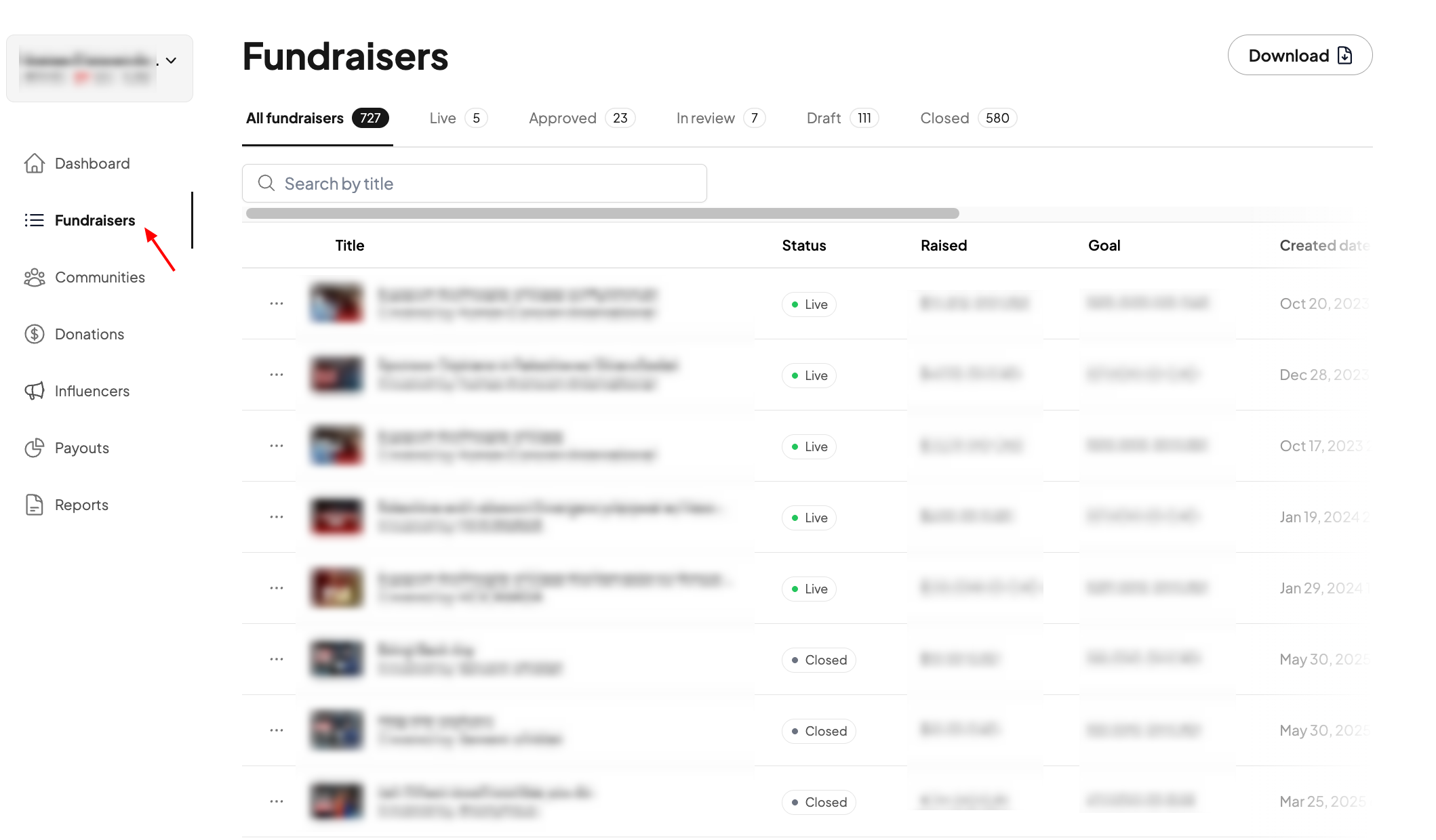 - This tab shows a list of all fundraisers connected to your account. You can view fundraisers going as far back as 2020.