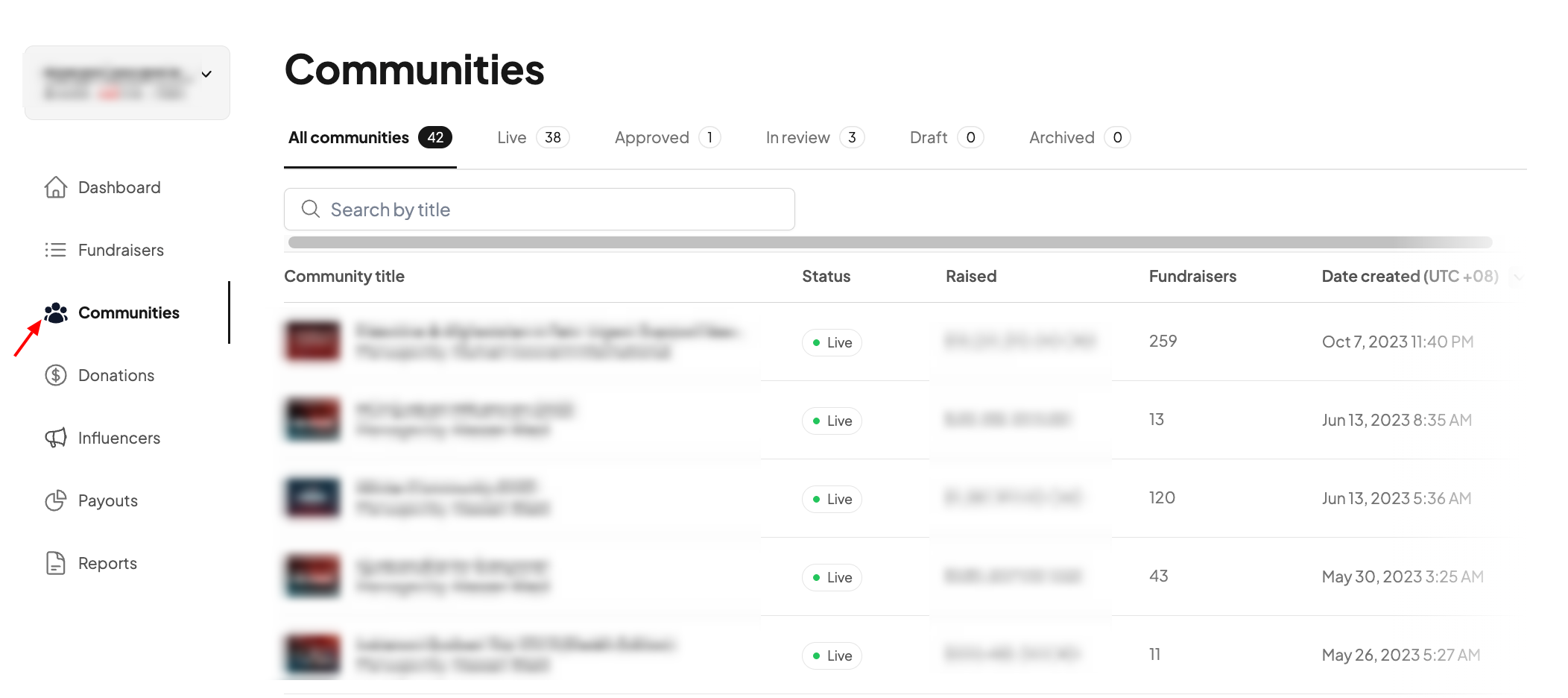 - If you have created or are part of a community page, this tab lets you view and manage community-linked fundraisers.