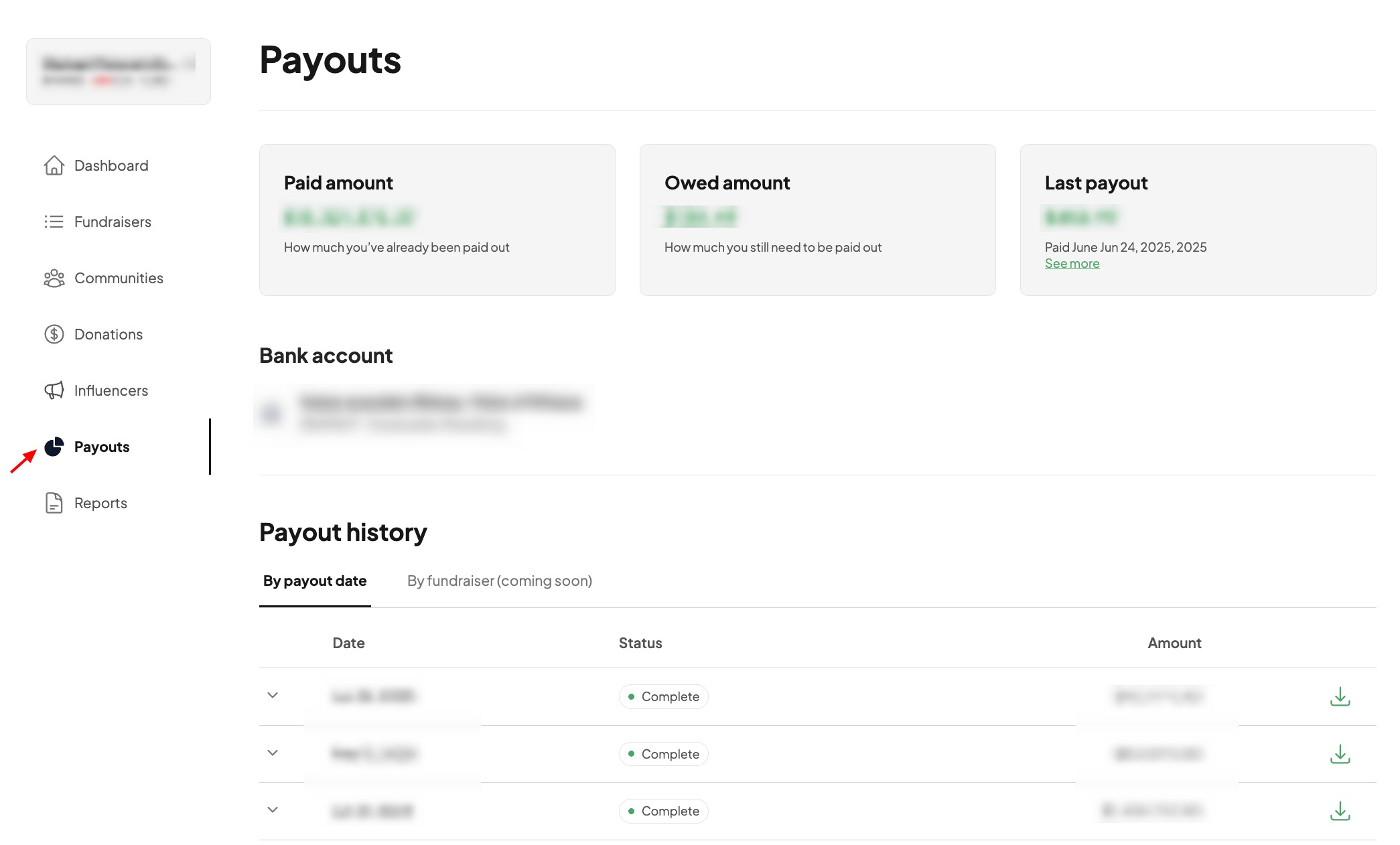 - Payout history with full breakdowns (gross raised, processing fees, refunds, etc.)